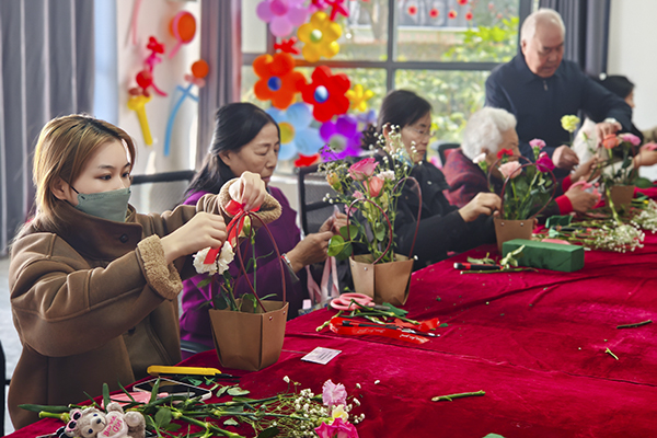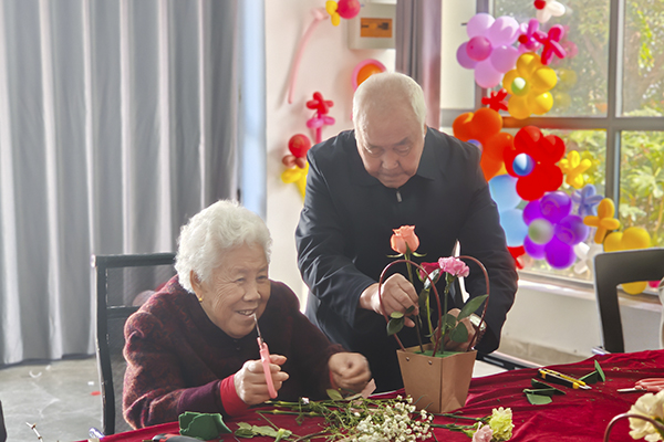 在弘道、樱花苑社区,社区工作人员精心准备了玫瑰、满天星、尤加利叶等鲜切花材,专业老师现场讲解花艺知识,从色彩搭配、花枝修剪、造型设计到插花技巧逐一示范指导。大家认真聆听、动手实践,修枝剪叶、错落搭配,将一朵朵鲜花巧妙组合,原本普通的花材经过精心创作,变成了一盆盆错落有致、生机盎然的花艺作品,脸上洋溢着幸福满足的笑容。