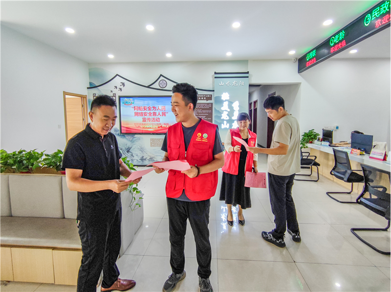 活动现场,志愿者们深入人员流动性强的镇便民服务大厅,通过LED屏循环播放网络安全标语,营造浓厚氛围。同时,志愿者向办事群众及工作人员发放《网络安全法》《个人信息保护法》等宣传资料,并结合案例进行解读,提醒群众妥善保护个人信息,避免在非正规网站填写敏感信息或透露验证码,进一步强化大家对网络安全风险的认知。现场群众纷纷表示,在今后的网络生活中会更加谨慎,提高自我保护意识。