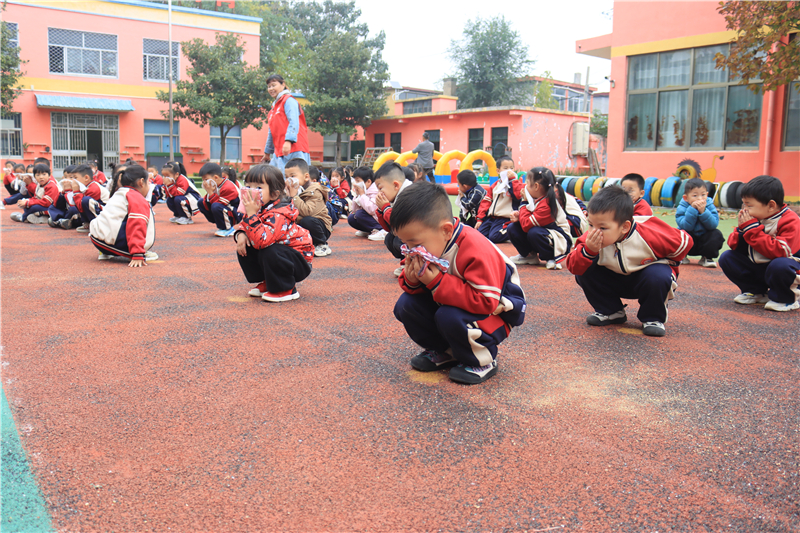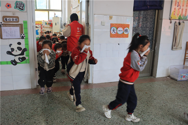 随后的消防演练环节,随着一阵急促的消防警报声响起,演练正式拉开帷幕。各班老师迅速按照应急预案,组织幼儿用湿毛巾捂住口鼻,弯腰低姿,沿着安全通道快速、有序地撤离教室。整个过程中,志愿者和老师们全程引导,及时提醒孩子们保持距离、避免推挤,确保了撤离行动高效且安全。