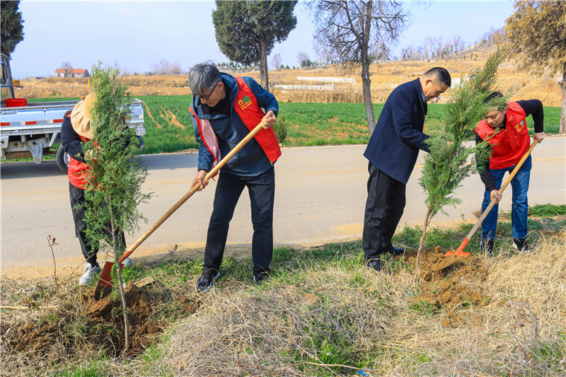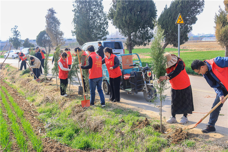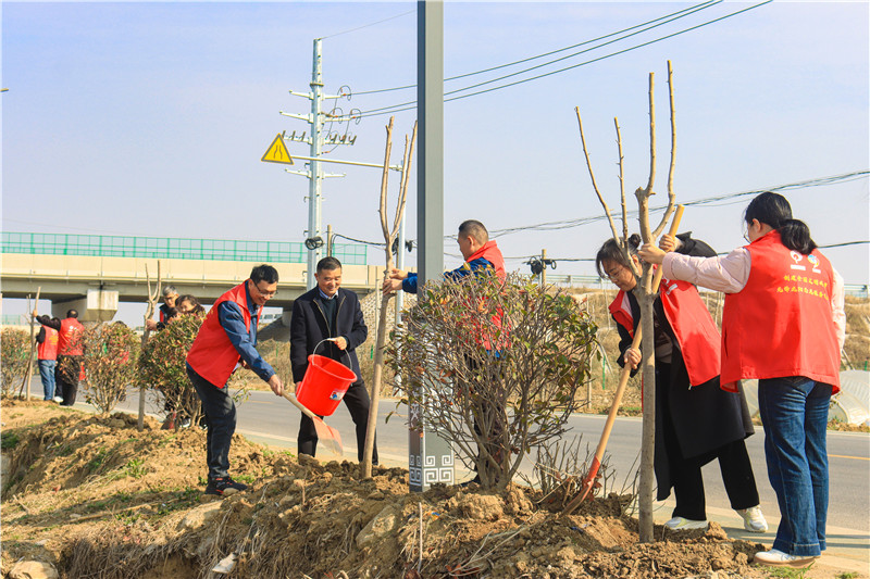 随后,参与人员热情投入,大家三两成组,默契配合——挥锹挖土、扶苗填坑、提水浇灌,忙而有序。身穿红马甲的志愿者们穿梭其间,忙碌的身影与欢声笑语交织,整个植树现场呈现出热火朝天的劳动景象。经过数小时的共同努力,一排排本地适生苗木迎风而立、错落有致,为初春的龙阳增添了勃勃生机。