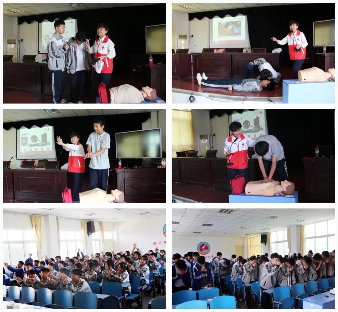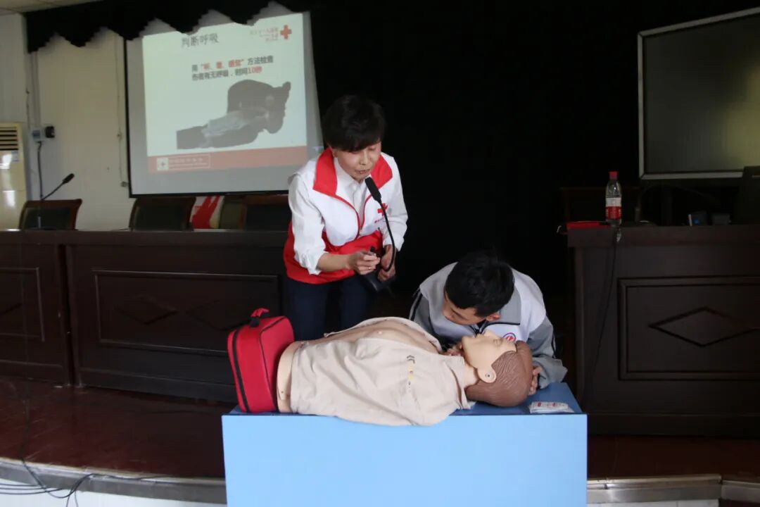 活动现场,培训师龙兴霞通过模拟的方式用通俗易懂的语言,详细地讲解了心肺复苏的紧急处理方法和急救措施,着重针对如何判断无意识无呼吸状态、开放气道、胸外按压等应急救护方法进行示范,并引导师生们进行实操,对实操不到位的地方及时指正,做到“人人会急救,急救为人人”。