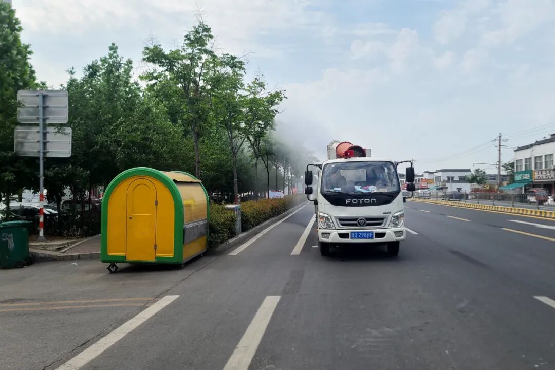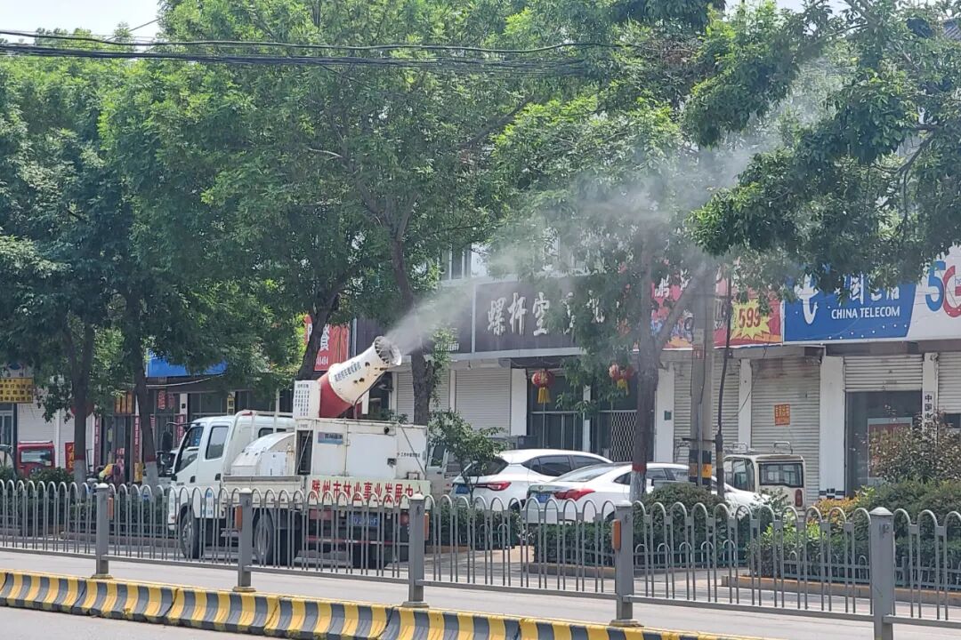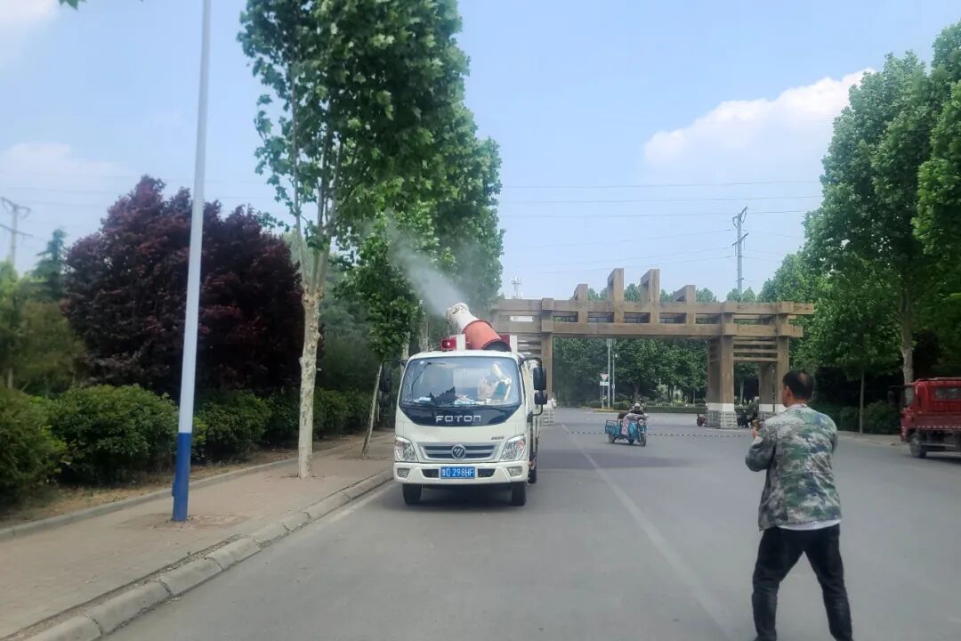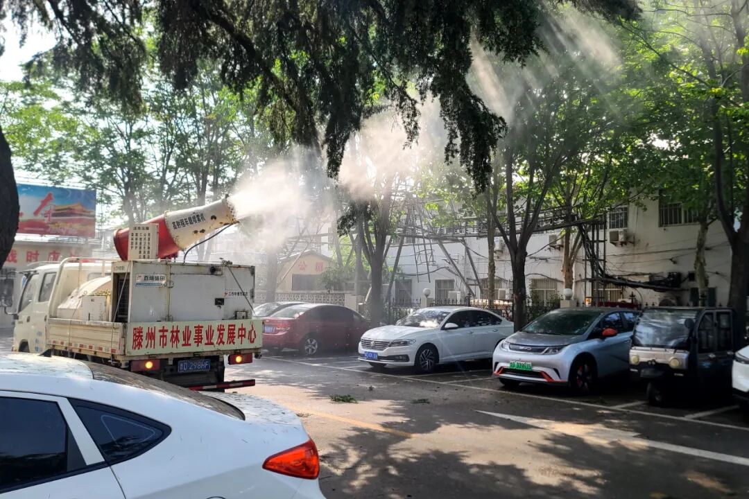 工作现场,作业人员采用吡虫啉和高效氯氰菊酯等按照科学配比的低毒生物制剂,采取机械作业车高压喷施的方法全方位喷洒,确保不留死角,达到高标准的除虫效果。同时根据树木灭虫需要和在确保村民出行安全的情况下错时错峰喷洒农药,有效预防以蚜虫和美国白蛾为主的病虫害对绿化植物及群众的侵害,把各类害虫消灭在萌芽阶段,保护树木健康生长。