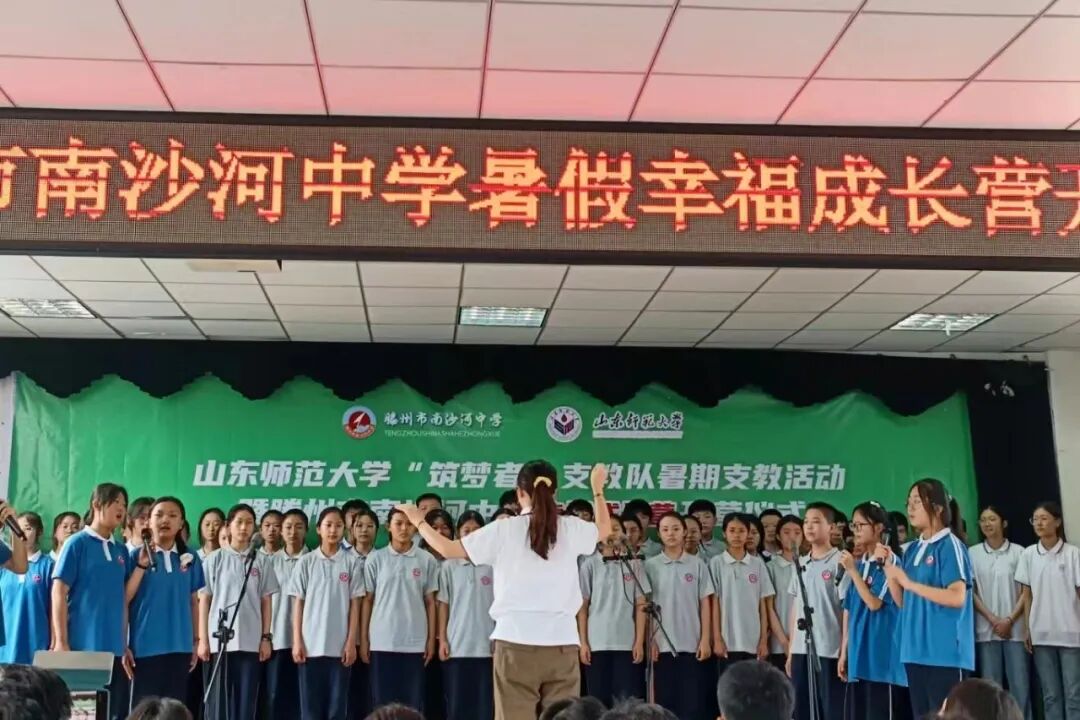 市教育和体育局四级主任科员刘玲玲在讲话中强调,市局在增强学校育人功能和提高教育服务能力上下功夫,为解决义务教育阶段困境儿童无人照看缺关心、无人陪伴缺温暖、心理自闭缺沟通、安全方面缺意识的“四缺”难题,创新创建假期快乐成长营,在节假日期间为困境儿童提供公益性托管服务,南沙河中学幸福成长营就是这其中的优秀代表。对学校坚持把立德树人作为教育的根本任务,以“五好”为工作目标,致力于“让每一个学生幸福成长”的教育愿景,建立困境学生关爱帮扶机制,积极开展暑期学生关爱活动给予高度肯定。市妇联党组成员、副主席、市妇女儿童事务服务中心主任王蕾表示了期待在更高层次、更宽领域上与高校开展深度合作,共同探索教育发展的新路径、新模式。“山河无恙,国富民强”,其终将在一代又一代青年全力奋斗下实现。最后,共青团滕州市委副书记张恩铭正式宣布幸福成长营开营,所有嘉宾齐聚舞台,共同触发了幸福成长营的启动球,在志愿者和学生们的热烈欢呼中,2024年山东师范大学“筑梦者”支教队暑期支教活动暨滕州市南沙河中学“幸福成长营”正式启动。南沙河中学与“筑梦者”团队成员合唱的《少年中国说》以激昂的旋律和歌词,彰显了爱国责任感和对未来的坚定期许。作为一所拥有多个社团的乡村中学,在开营仪式结束后,各位领导嘉宾一同参观南沙河中学丰富的社团文化,感受学生多彩的校园文化生活。