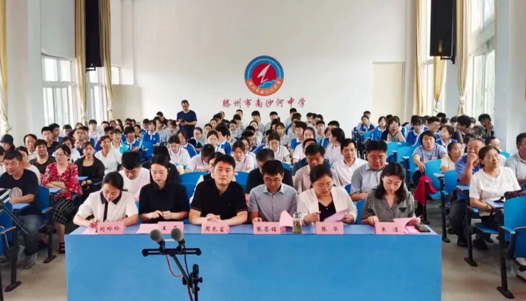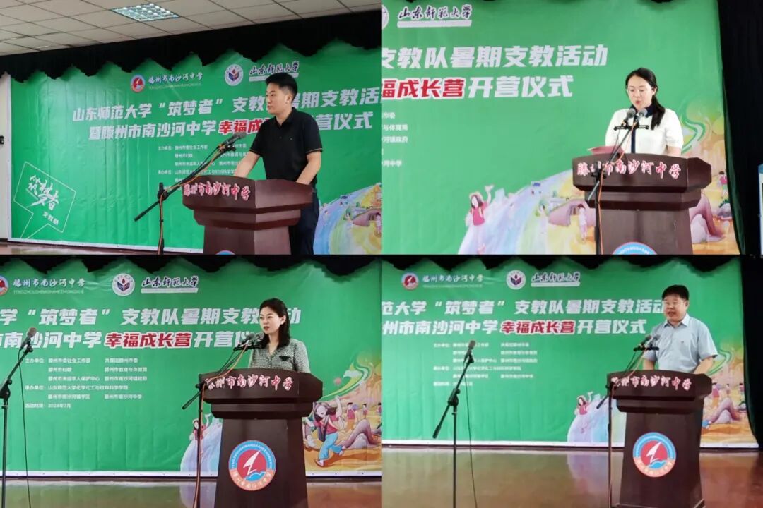 7月16日,山东师范大学“筑梦者”支教队暑期支教活动暨滕州市南沙河中学“幸福成长营”开营仪式在南沙河中学报告厅圆满落幕。山东师范大学化学化工与材料科学学院团委干部周长富,滕州市委社会工作部一室筹备组张华,共青团滕州市委副书记张恩铭,市妇联党组成员、副主席、市妇女儿童事务服务中心主任王蕾,市教育和体育局四级主任科员刘玲玲与思政科科长崔建华,市未成年人保护中心主任韩文林,南沙河镇副镇长朱洁,镇新时代文明实践所、团委、山东师范大学支教团成员、南沙河中学全体教职工、家长代表和全体营员参加活动。