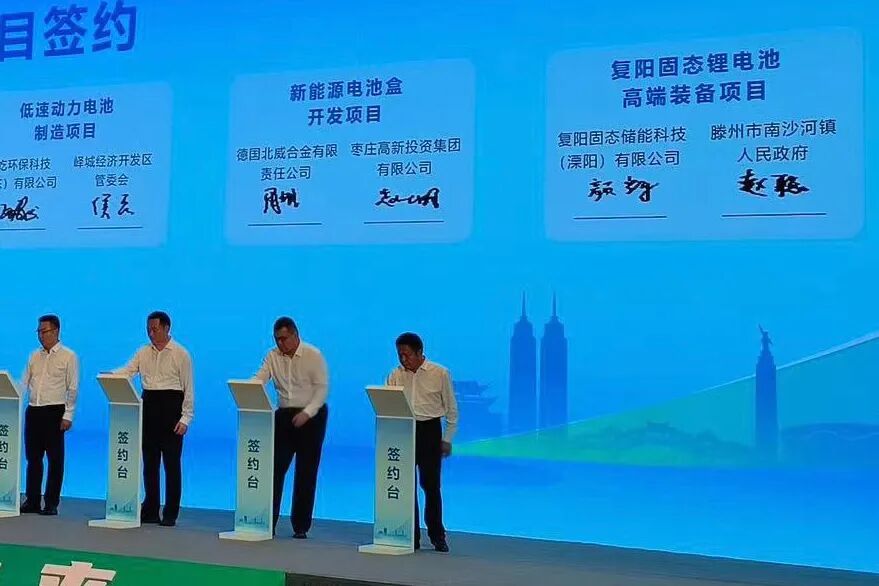 开幕式上,南沙河镇党委书记赵聪与复阳固态锂电池高端装备项目负责人现场签约。