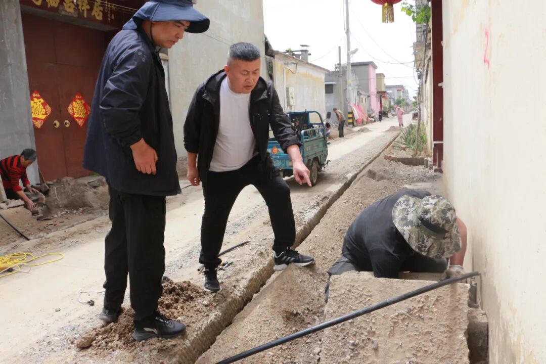 5月7日,在南沙河镇崔庄村自来水供水管网提升改造工程现场,路面切割机刀盘切入混凝土路基发出巨大的轰鸣声,村党支部书记、主任崔德宝正指挥着作业施工人员沿切好的沟缝铺设管道、连接入户水表……现场一片火热的建设景象。