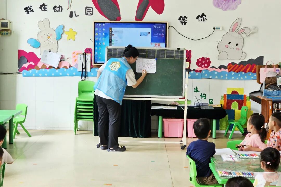 “先把红色的积木放在最下面,是不是就可以搭起来啦?”中心幼儿园分园南池幼儿园里,课桌上的积木在小朋友们的奇思妙想下摆成了各种各样的形状。轻梦支教队队员郑盈盈坐在小朋友旁边,耐心地引导着孩子们,孩子们在她的指导下,逐渐掌握了积木搭建的技巧,脸上露出了笑容。
