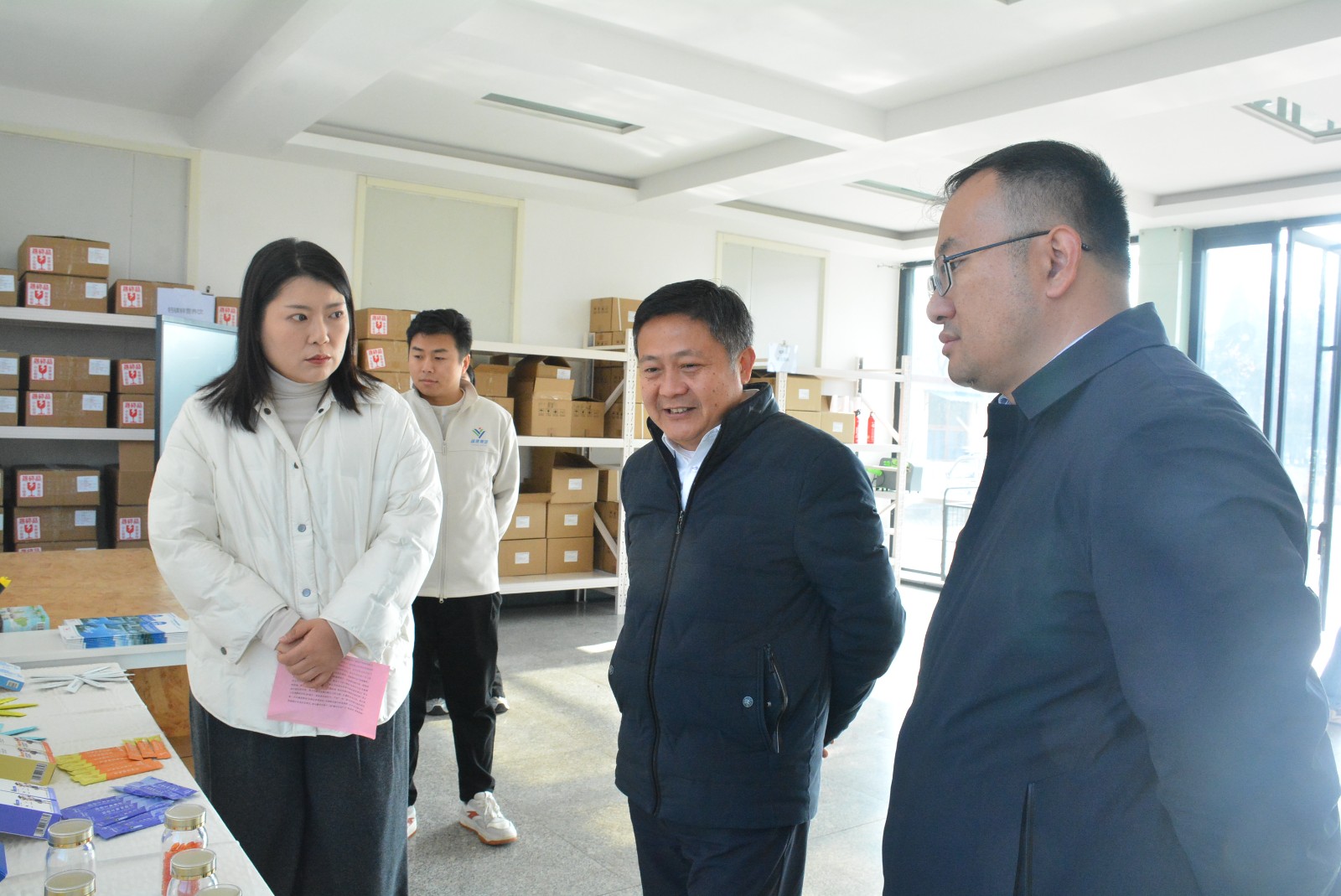 赵聪一行来到山东益康药业股份有限公司,与企业负责人面对面深入交流,实地察看新型制剂等核心产品,详细询问产品研发周期、市场占有率及产业链配套情况。