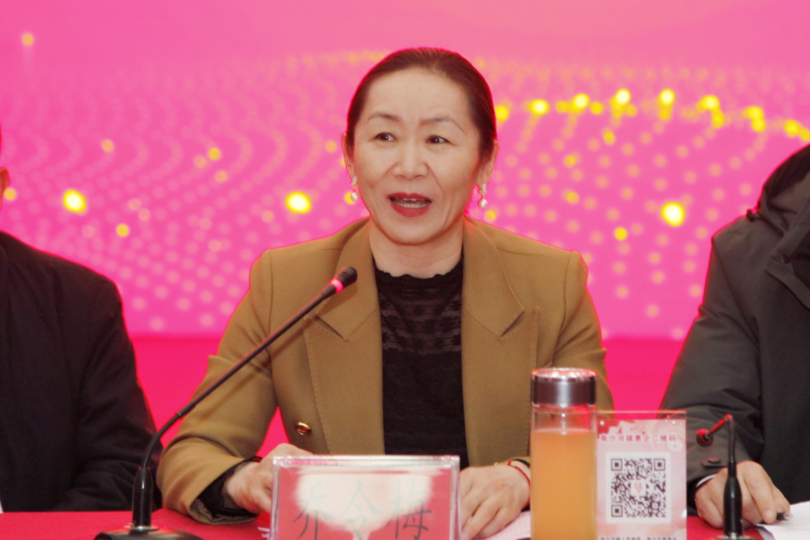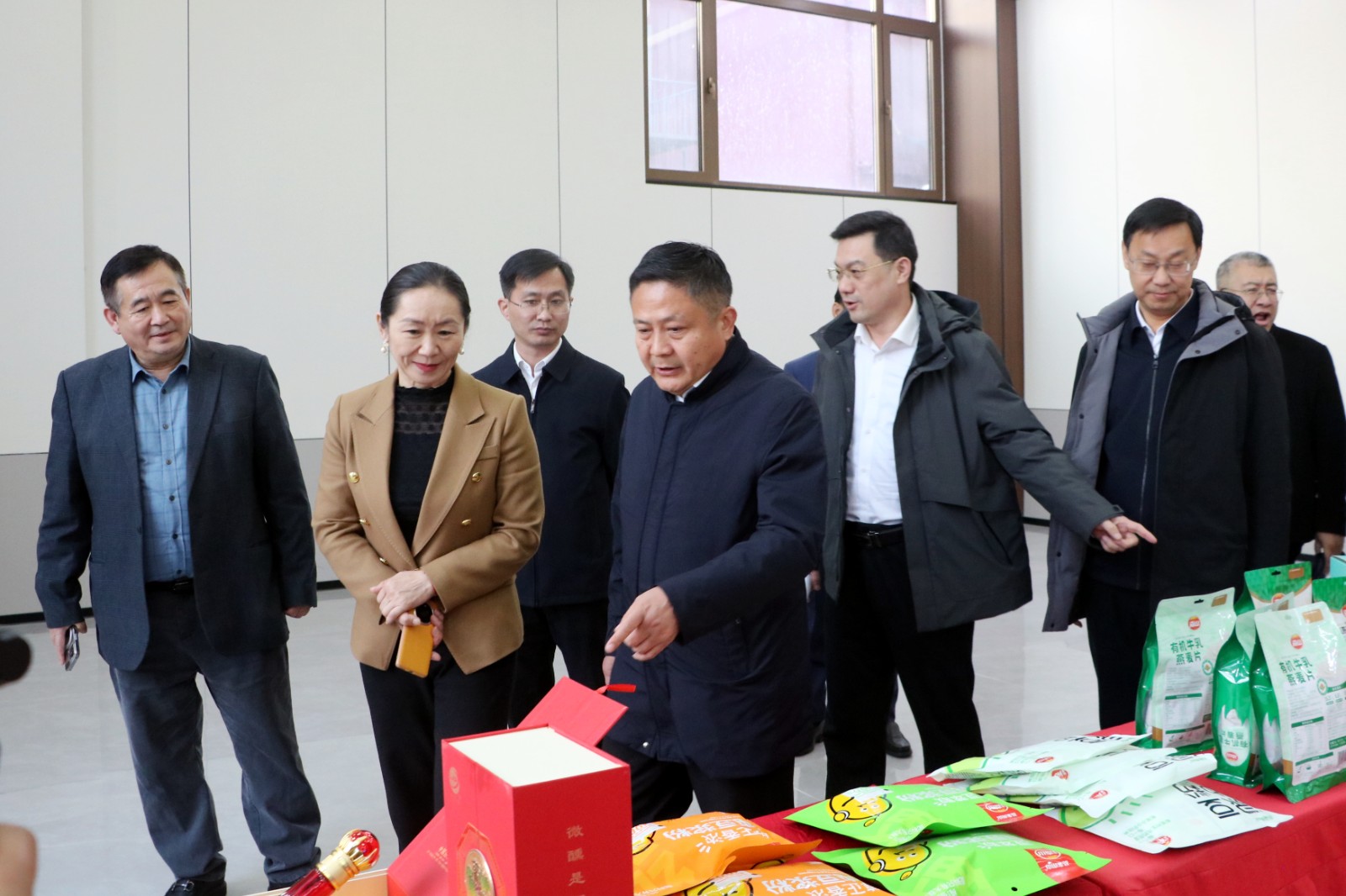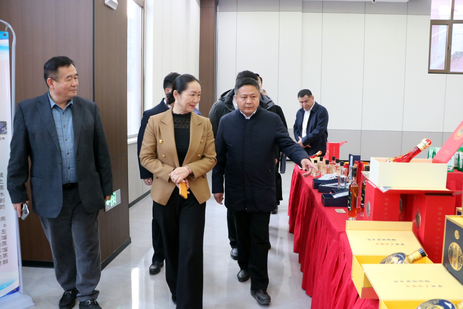与会前,乔令梅与参会人员一同参观了南沙河镇商会部分会员企业产品展。