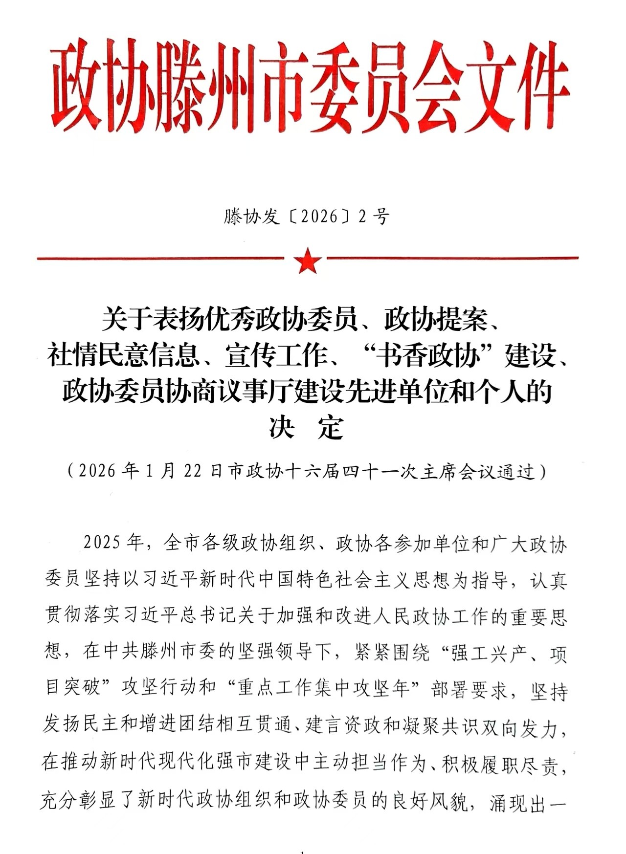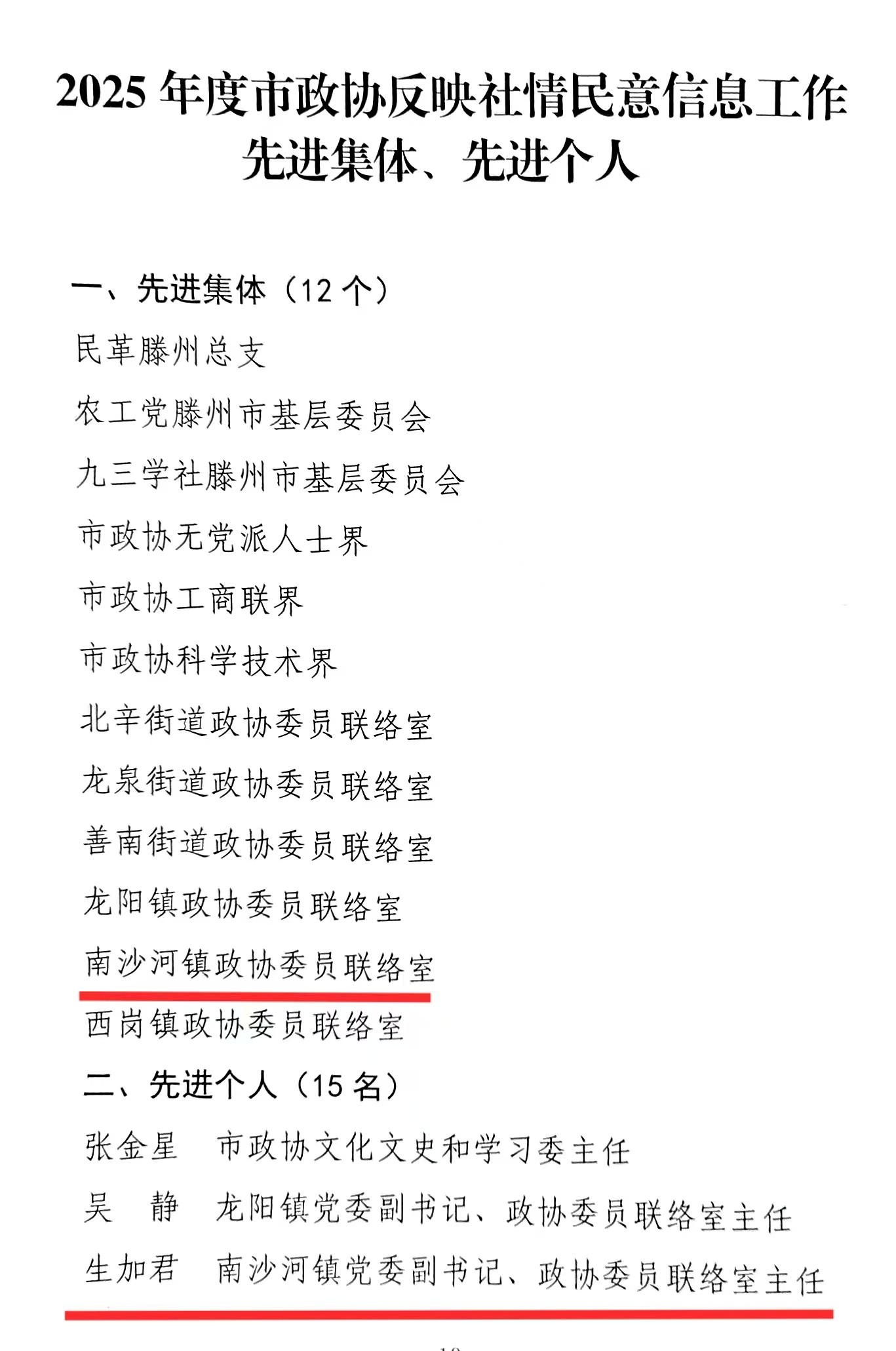 2月5日,从市政协十六届五次会议上传来喜讯,南沙河镇政协工作荣获多项荣誉:镇政协委员联络室获得2025年度滕州市政协反映社情民意信息工作先进集体;镇政协委员协商议事厅获得2025年度枣庄市政协委员协商议事厅建设先进单位;南沙河镇党委副书记、政协委员联络室主任生加君获得2024—2025年度全市优秀政协委员、2025年度滕州市政协反映社情民意信息工作先进个人;联络办公室主任张玉春获得2025年度滕州市政协宣传工作先进个人;王力关于加快我市新能源产业发展的建议、司伟关于推进全市民众国防安全教育的建议被评为市政协十六届四次会议优秀提案。