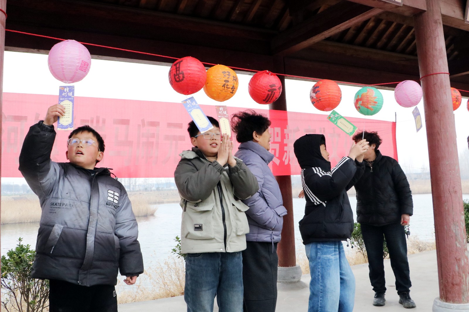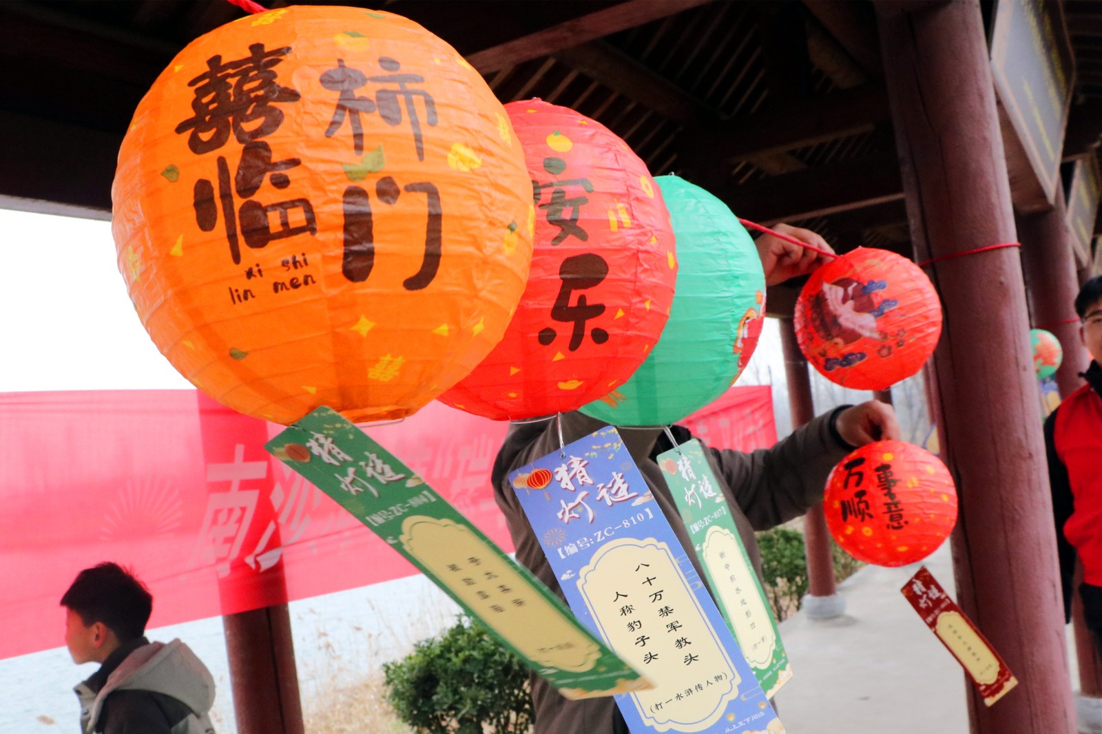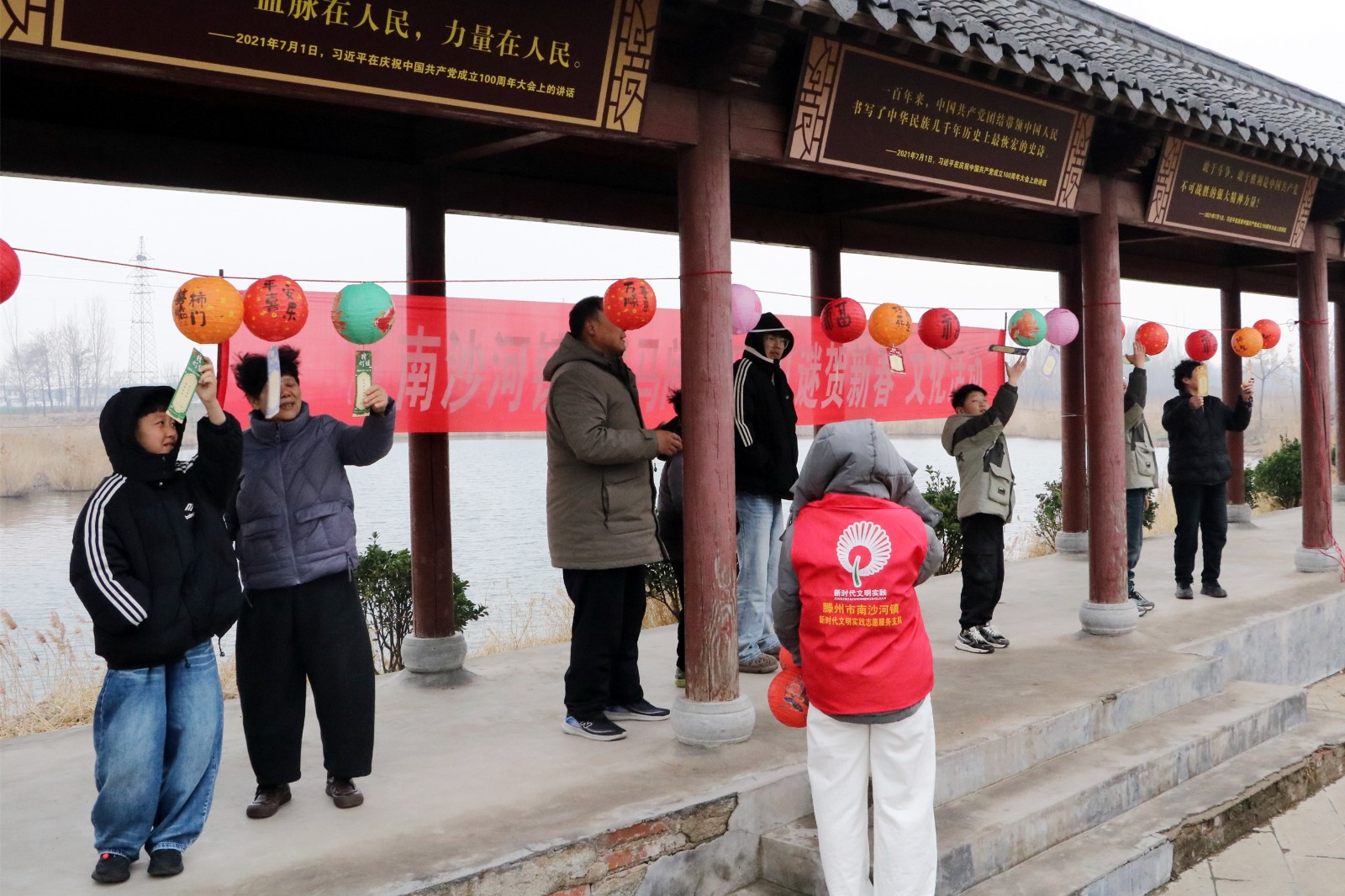 活动现场张灯结彩,年味浓郁。五彩斑斓的灯笼沿漷河岸边错落悬挂,红彤彤的灯谜条随风摇曳,将湿地公园装点得格外喜庆。此次活动精心设计了涵盖马年成语、乡村振兴知识、非遗文化常识、文明实践倡议等多个领域的灯谜,既有传统韵味,又具时代特色,兼具知识性与趣味性。