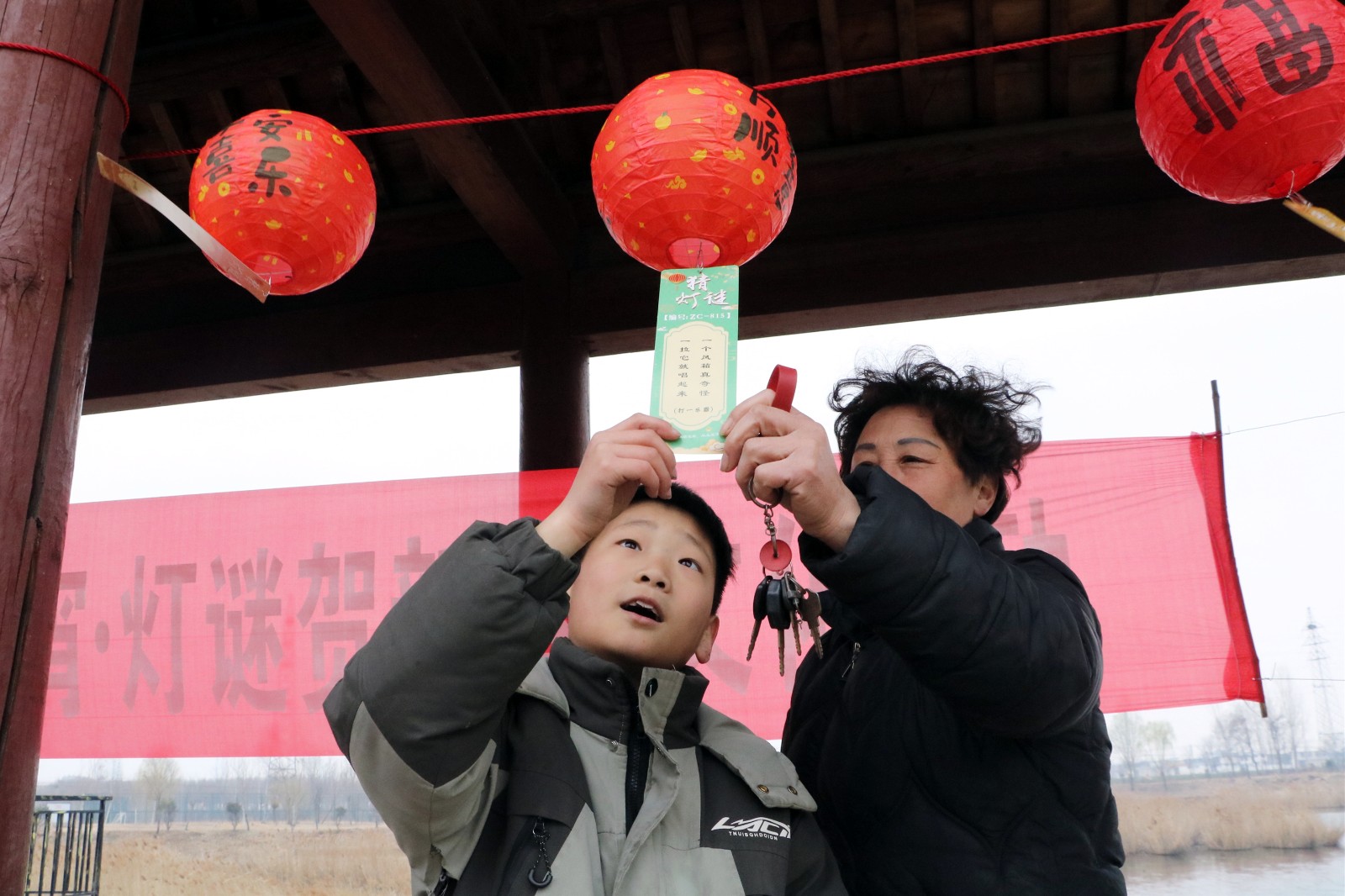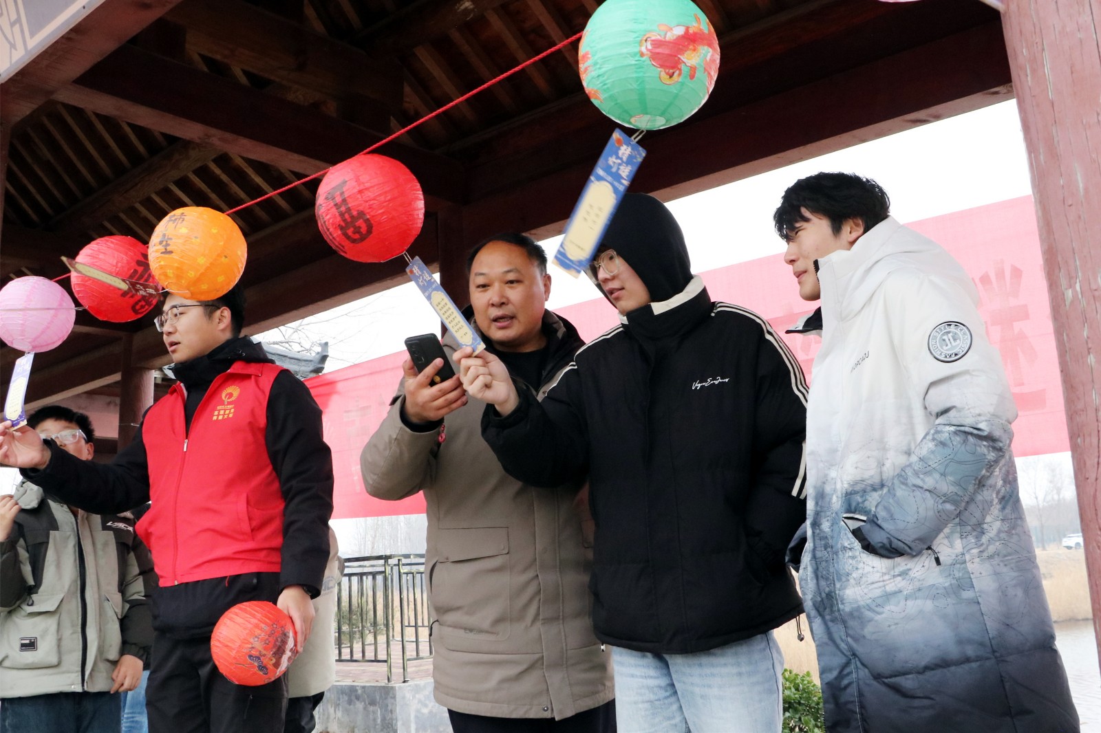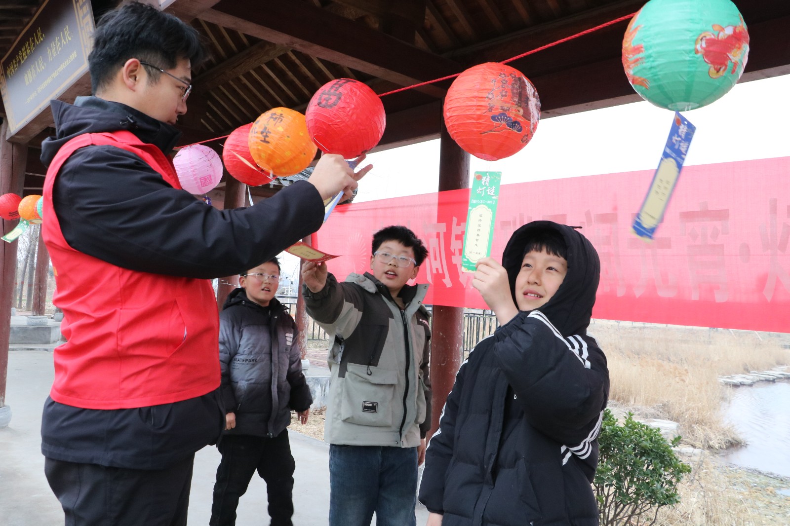 活动现场张灯结彩,年味浓郁。五彩斑斓的灯笼沿漷河岸边错落悬挂,红彤彤的灯谜条随风摇曳,将湿地公园装点得格外喜庆。此次活动精心设计了涵盖马年成语、乡村振兴知识、非遗文化常识、文明实践倡议等多个领域的灯谜,既有传统韵味,又具时代特色,兼具知识性与趣味性。