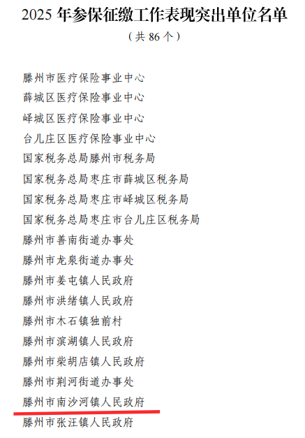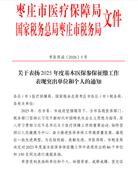 近日,枣庄市医保局、税务局下发《关于表扬2025年度基本医保参保征缴工作表现突出单位和个人的通知》,南沙河镇被表扬为2025 年参保征缴工作表现突出单位、高敬营被表扬为突出个人。