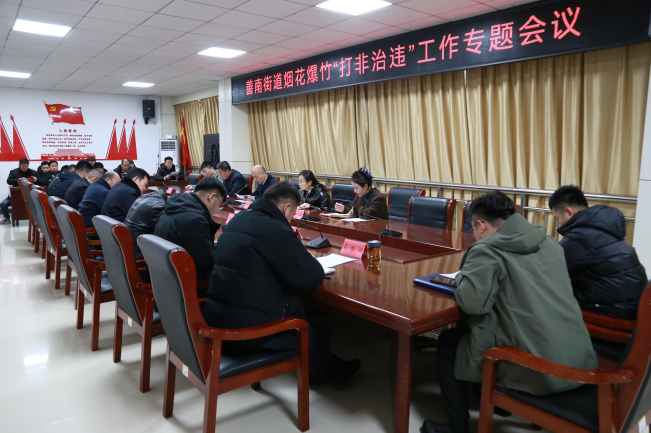 12月23日, 善南街道召开烟花爆竹“打非治违”工作专题会议。党工委副书记、办事处主任鲁大鹏,关工委主任蔡灿,办事处副主任李栋,办事处副主任刘华,应急安全保障中心主任程春铭,派出所,市场监管所,各社(片)区书记,环保所、经发办、投促办、物业办负责人,应急安全保障中心全体人员以及.辖区物业公司负责人参加会议。