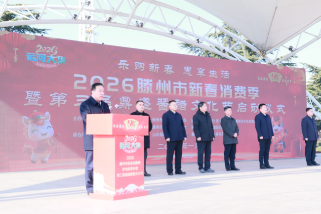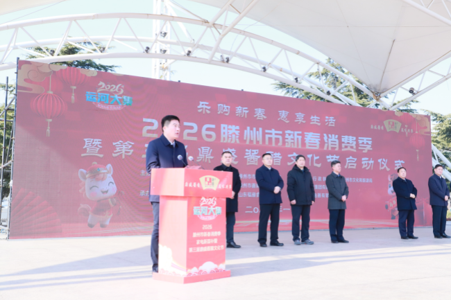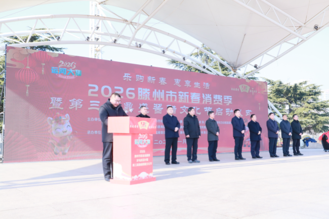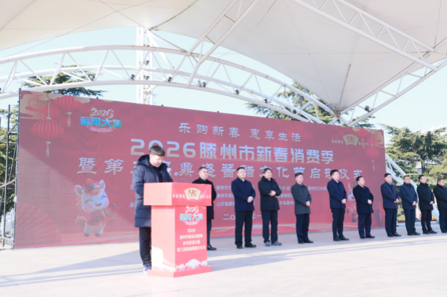 腊月初五启新章,年味浓情满滕州。1月23日,乐购新春 惠享生活——2026滕州市新春消费季暨第三届鼎盛酱醋文化节正式启幕。市政府党组成员、副市长徐方坤,市商务和投资促进局党组书记、局长、三级调研员宗兆波,市市场监督管理局党组书记、局长陈凡锋,市综合行政执法局党组书记、局长张永正,市文化和旅游局局长王茜,市商业物资行业事务中心党组书记、主任史孝峰;善南街道党工委书记庞传军;滕州城市发展集团有限公司党委书记、董事长马骏; 各镇街分管负责同志,参展企业负责人以及相关工作人员参加活动。