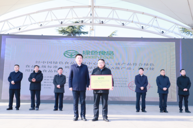 徐方坤颁发中国绿色食品发展中心授予滕州市鼎盛酿造有限责任公司“头道酱油、天然晒醋”产品“绿色食品证书”。