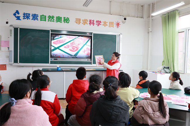 活动中,非遗志愿者老师用通俗直白的语言,为孩子们讲解剪纸的历史渊源、流派特色及基础技法,结合吉祥纹样作品解读背后的文化寓意,瞬间点燃孩子们对这门传统技艺的兴趣。实操环节,志愿者手把手指导红纸对折、图案勾勒、剪刀运用等技巧,细致叮嘱“起刀稳、行刀匀、收刀准”的诀窍。孩子们兴致盎然,手持剪刀潜心创作,福字、生肖马等纹样逐次跃然红纸之上,教室里的“咔嚓”声与欢声笑语交织成趣。