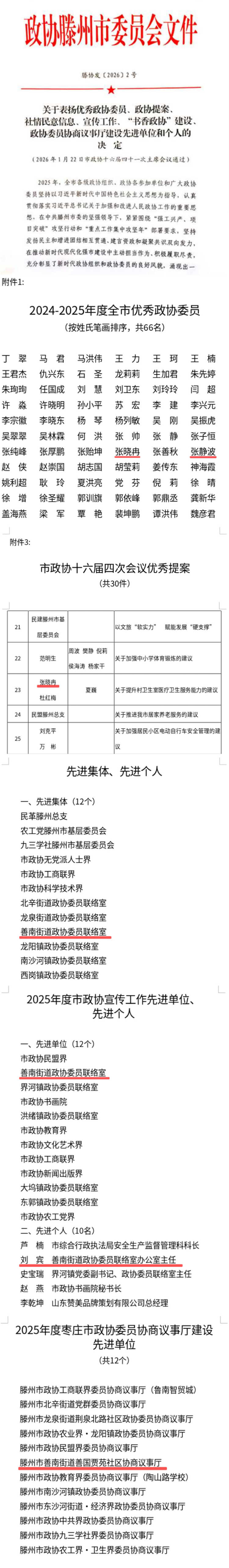 2月5日,从市政协十六届五次会议上传来喜讯,善南街道政协工作荣获多项荣誉。街道政协委员联络室被评为“2025年度市政协反映社情民意信息工作先进集体”,2025年度市政协宣传工作先进单位;街道善国贾苑社区协商议事厅被评为“2025年度枣庄市政协委员协商议事厅建设先进单位”,张晓冉、张静波被评为“2024-2025年度全市优秀政协委员”,张晓冉、杜红梅关于提升村卫生室医疗卫生服务能力的建议被评为市政协十六届四次会议优秀提案,刘宾被评为2025年度市政协宣传工作先进个人。