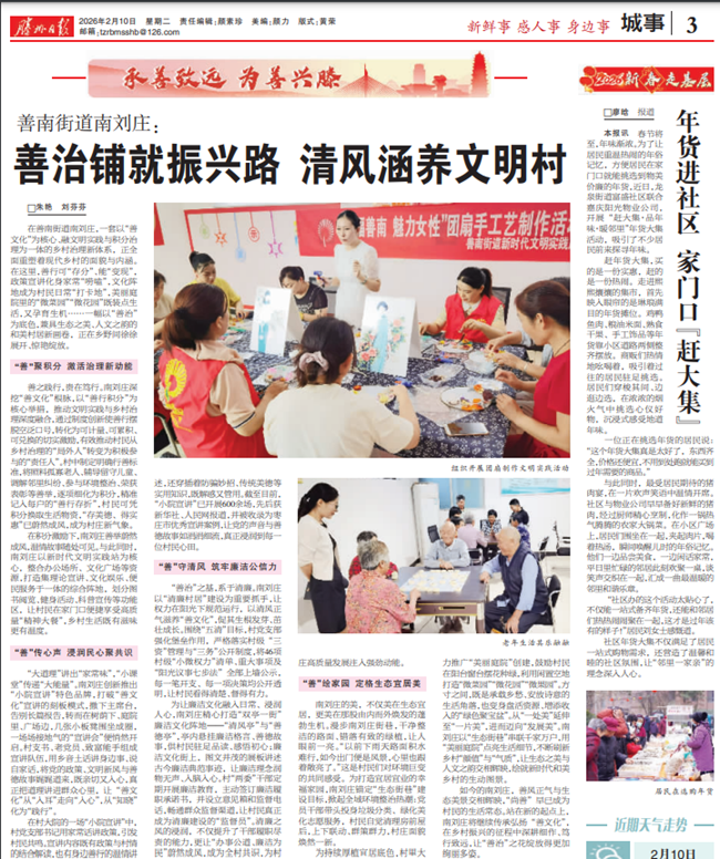 在善南街道南刘庄,一套以“善”为核心、融文明实践与积分治理为一体的乡村治理新体系,正全面重塑着现代乡村的面貌与内涵。在这里,善行可“存分”、能“变现”,政策宣讲化身家常“唠嗑”,文化阵地成为村民日常“打卡地”,美丽庭院里的“微菜园”“微花园”既妆点生活,又孕育生机……一幅以“善治”为底色,兼具生态之美、人文之韵的和美村居新画卷,正在乡野间徐徐展开、惊艳绽放。