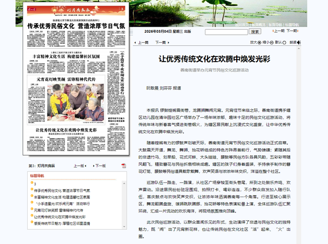 锣鼓铿锵震街巷,龙腾狮舞闹元宵!3月2日,马年元宵佳节之际,善南街道携手辖区幼儿园在清华园社区广场举办了一场年味浓郁、趣味十足的民俗文化巡游活动,将传统年味与新春喜气揉进街巷烟火,为辖区居民献上沉浸式文化盛宴,让中华优秀传统文化在欢腾中焕发光彩。