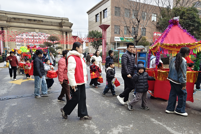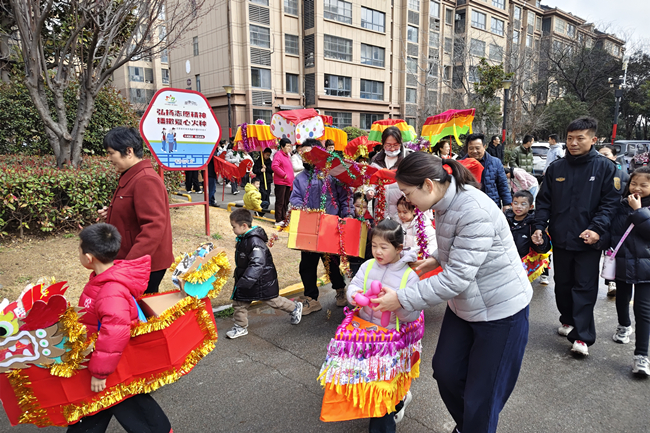 上午九时,铿锵有力的锣鼓声划破天际,活动正式启幕。大鼓震天开道,舞龙、舞狮、抬花轿组成的特色方阵昂首前行,气势磅礴;紧随其后的非遗竹马、旱船、花式河蚌、大头娃娃、腰鼓等民俗方队各具风韵,五彩彩带随风翻飞,精致簪花与民俗折扇相映成趣。辖区萌娃身着盛装,手持亲手制作的簪花灯笼、腰鼓等民俗道具载歌载舞,欢声笑语与浓浓年味交织,洋溢在整个社区。