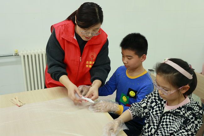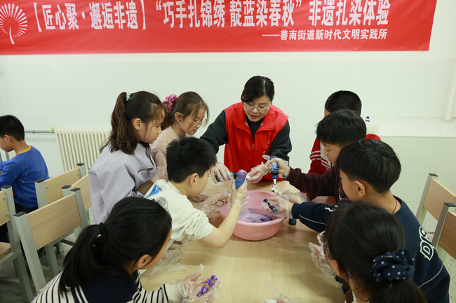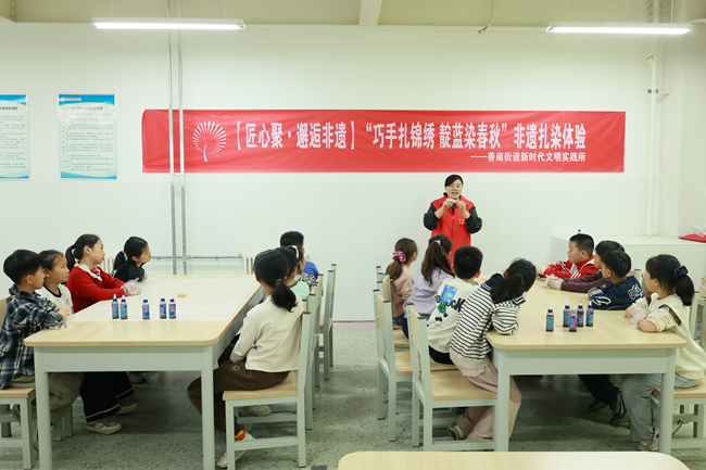 为深入推进文化社区建设,让非遗文化浸润校园、扎根童心,4月3日,善南街道新时代文明实践所“匠心聚•邂逅非遗”品牌项目走进清华园小学非遗实践基地,开展“巧手扎锦绣 靛蓝染春秋”非遗扎染体验活动,以沉浸式体验让非遗从“陈列品”变为可触摸的生活美学,丰富校园与社区文化活力。
