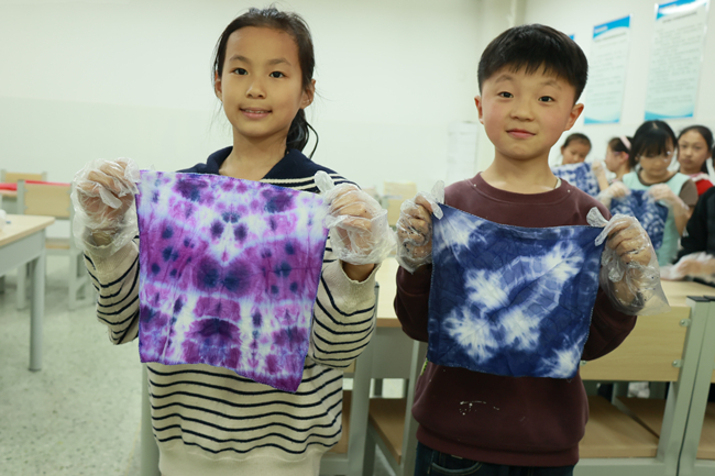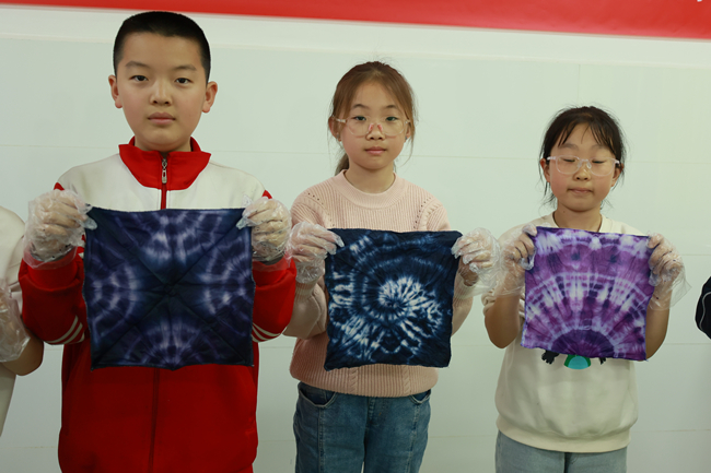 体验环节,同学们围坐协作、沉浸式创作,或折或缠、或捆或扎,指尖翻飞间为白布赋予独特造型;在志愿者指导下滴上靛蓝染液,拆开布料的瞬间,冰裂纹、蝴蝶纹等纹样跃然其上,孩子们脸上满是自豪与喜悦。有学生说道:“以前只在课本上见扎染,亲手体验才懂它的魅力,这不仅是手艺,更是珍贵的文化传承。”