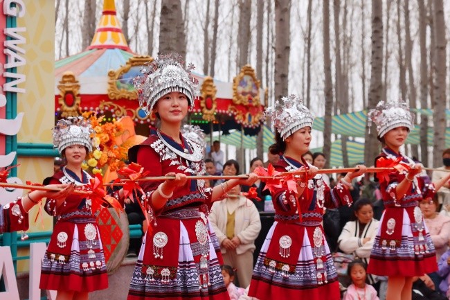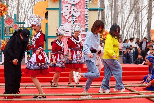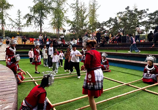 文艺汇演颂华章,载歌载舞庆团圆。九龙湾水上乐园与北赵核心区乡村大舞台轮番上演《女儿国·歌舞相亲大会》《盘丝洞·唐僧闯关记》等沉浸式情景剧,并呈现竹竿舞、扁担舞、采茶舞等富有民族风情的歌舞表演,以艺术形式礼赞祖国,传递团圆喜悦。观众时而屏息凝神,时而掌声雷动,他们表示:“在山水实景中欣赏这样高水平的演出,既享受了艺术之美,又感受到了浓厚的节日氛围。”