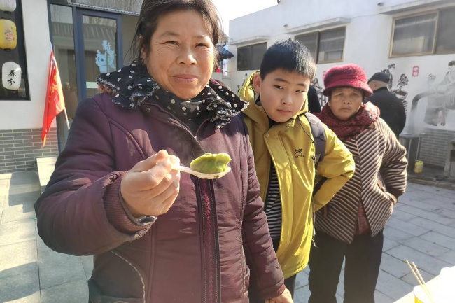 包饺子环节热闹非凡,大家自发分工、默契配合。现场群众娴熟地擀皮、包馅,动作行云流水;孩子们在家长和志愿者的指导下,认真模仿着捏合边角,虽形态各异却饱含童趣;现场专门为老人、儿童设置专属席位,端上暖心姜枣茶,细致入微的关怀让现场暖意融融。乡情打卡墙前,大家纷纷驻足留影,记录团圆瞬间,欢声笑语与水饺香气交织萦绕,勾勒出一幅温馨和睦的乡村团圆画卷。