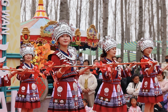 非遗贺岁,传统文化焕新生。九龙湾非遗文化大赏率先拉开序幕,成为游客追捧的热门打卡地。壮族嫁女实景演出以鲜活场景还原传统婚俗,服饰华美、仪态庄重,引人沉浸于民族风情之中;竹竿舞、扁担舞、采茶舞等经典民俗接连上演,欢快节奏与灵动舞姿吸引众多游客加入互动,现场笑声与掌声交织不断。移步非遗小院,则是另一番静心动手的雅趣。烙画、篆刻等非遗传承人现场展示绝活,并耐心指导游客亲手制作。一件件融入个人创意的作品在此诞生,让非遗不再是遥远的故事,而是可触碰、可带走的温暖纪念。
