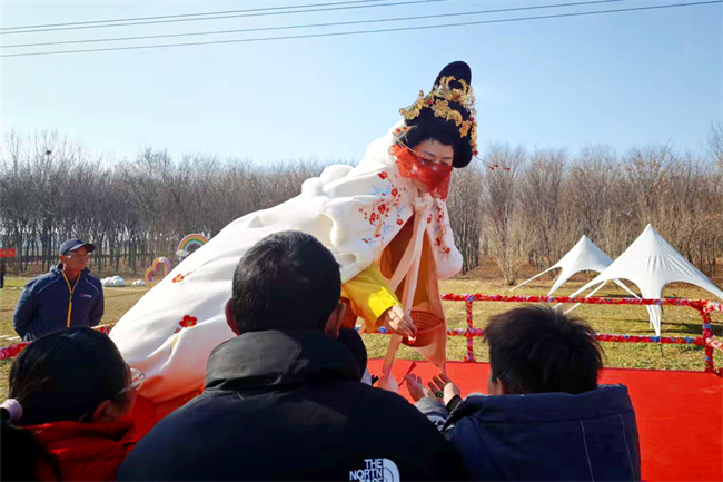 年集寻味,逛吃赏玩年意浓。市集上集结的本地特色年货、虎头鞋、生肖挂件等民俗手工艺品,以及糖画、糖葫芦等传统小吃,勾勒出满满的年味画卷,让人们在逛吃逛玩中重拾儿时的新年记忆。而另一边的爆款互动项目“大唐不倒翁”更是人气爆棚,身着大唐服饰的表演者翩翩起舞,裙摆飞扬,与游客温柔互动,上演了一场穿越古今的浪漫邂逅,让大家在沉浸式体验中感受传统文化的别样魅力。