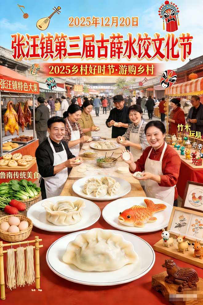 届时,现场不仅将举办热闹非凡的包饺子大赛和精彩纷呈的戏曲展演,更设有品类丰富的非遗年货大集,让您“一站式”领略传统韵味、尽享节庆喜悦。在品尝美味水饺的同时,您也将深切感受古薛文化的深厚底蕴,亲身感受张汪乡村的活力与热情。