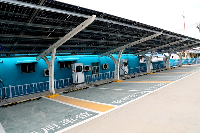 充电驿站构建了“光、储、充”一体的绿色供能系统。站内共设15台充电桩,包括10台120kW直流快充桩与5台14kW交流慢充桩,可同时为30辆新能源汽车提供高效补能。依托车棚建设的130kWp光伏发电单元,年均发电约15万度,配合200kWh储能系统,实现清洁能源就地消纳与智能调配,有效降低用电成本,提升能源韧性。