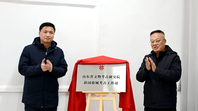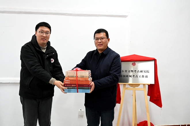 仪式现场,省文物考古研究院与滕州市政府共同为“山东省文物考古研究院薛国故城考古工作站”揭牌,省文物考古研究院向张汪镇政府赠送书籍。