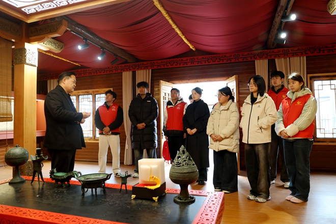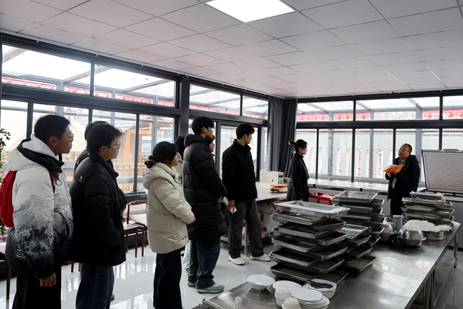 在杨楼村,大学生们实地参观了古薛文化馆和饺子研究院。村党支部书记杨学伟详细介绍了杨楼村依托古薛文化资源、打造特色民俗场馆、大力发展“饺子文化”品牌的历程。他提到,近年来杨楼村坚持文化引领与产业融合,通过挖掘传统民俗、引入特色餐饮、培育乡村旅游新业态,不仅盘活了村集体经济,还带动了村民在家门口就业增收。这些做法与成效引起学子们的浓厚兴趣。大家纷纷表示,通过实地走访,对张汪镇深厚的文化积淀、“中华饺子发源地”的文化品牌有了更加深刻的认识,也对文化赋能乡村振兴的路径有了更直观的感受。