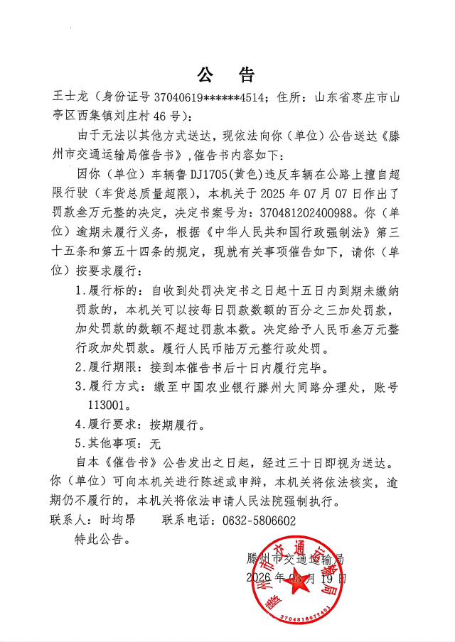 《滕州市交通运输局催告书(案号:370481202400988-王士龙)》送达公告