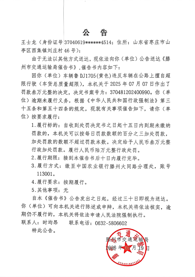 《滕州市交通运输局催告书(案号:370481202400990-王士龙)》送达公告