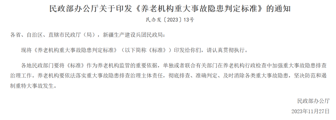 日前,民政部办公厅印发 《养老机构重大事故隐患判定标准》,要求各地民政部门将标准作为养老机构监管的重要依据,单独或者联合有关部门在养老机构行政检查中加强重大事故隐患排查治理。同时,要求养老机构依法落实重大事故隐患排查治理主体责任,彻底排查、准确判定、及时消除各类重大事故隐患。