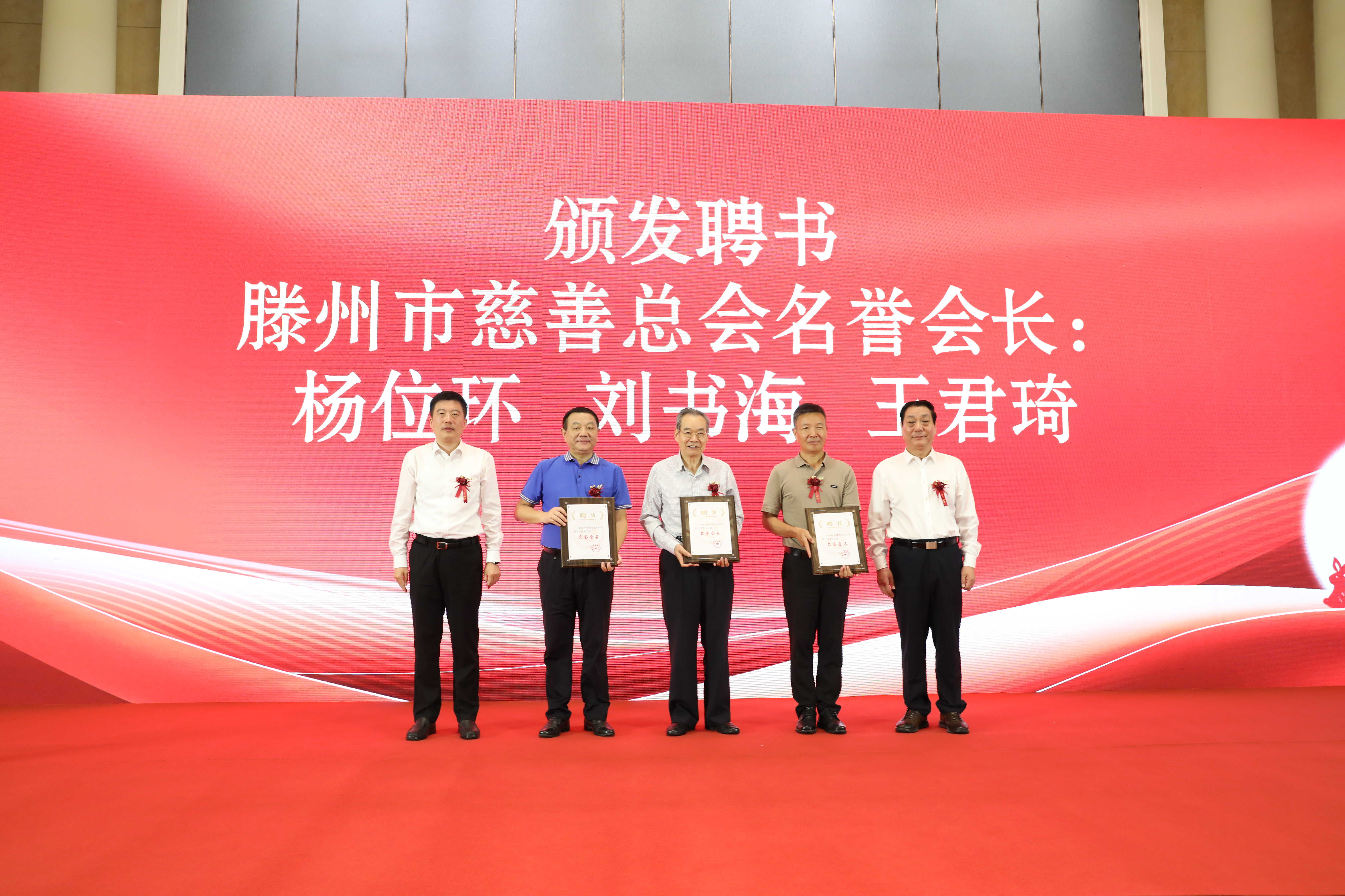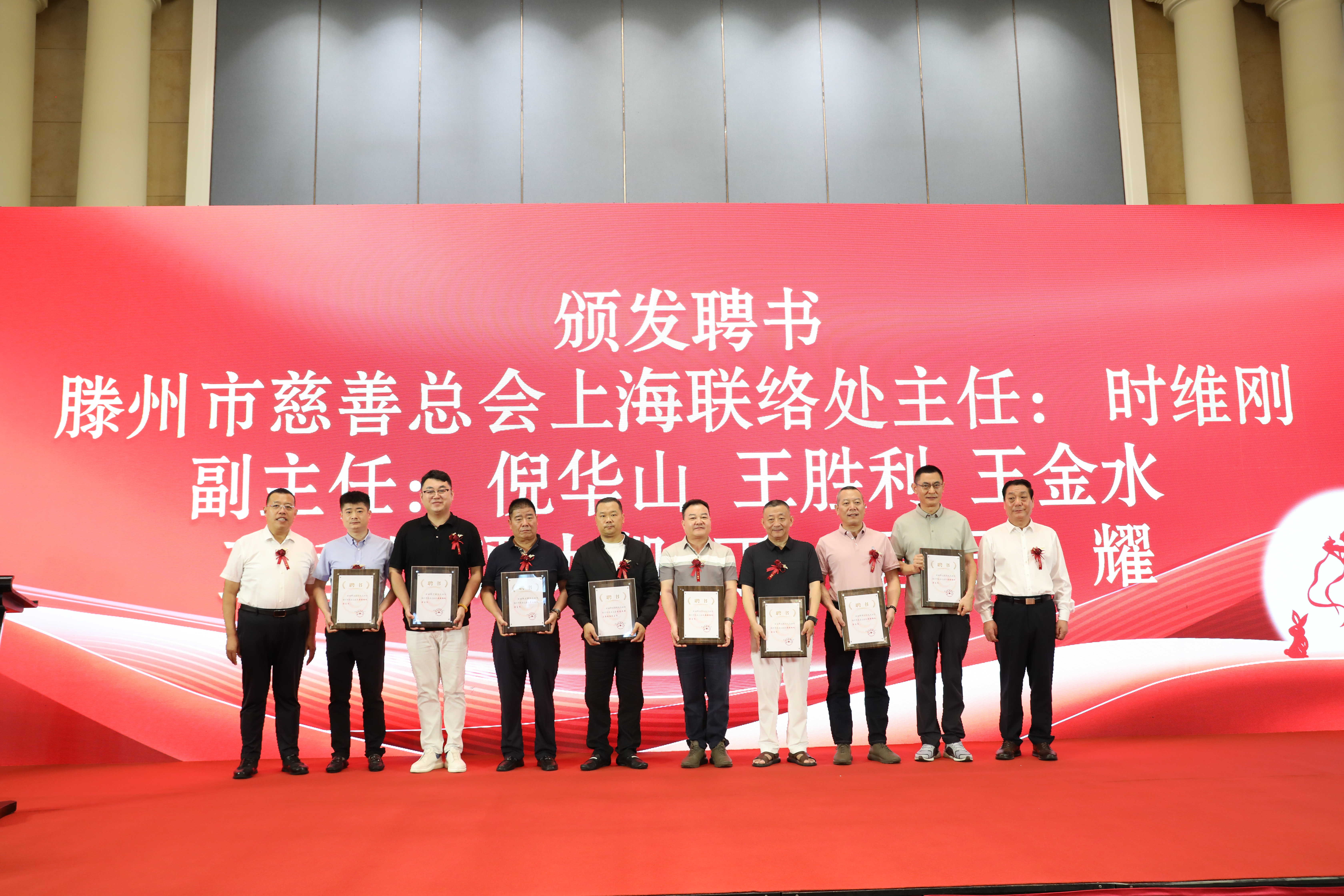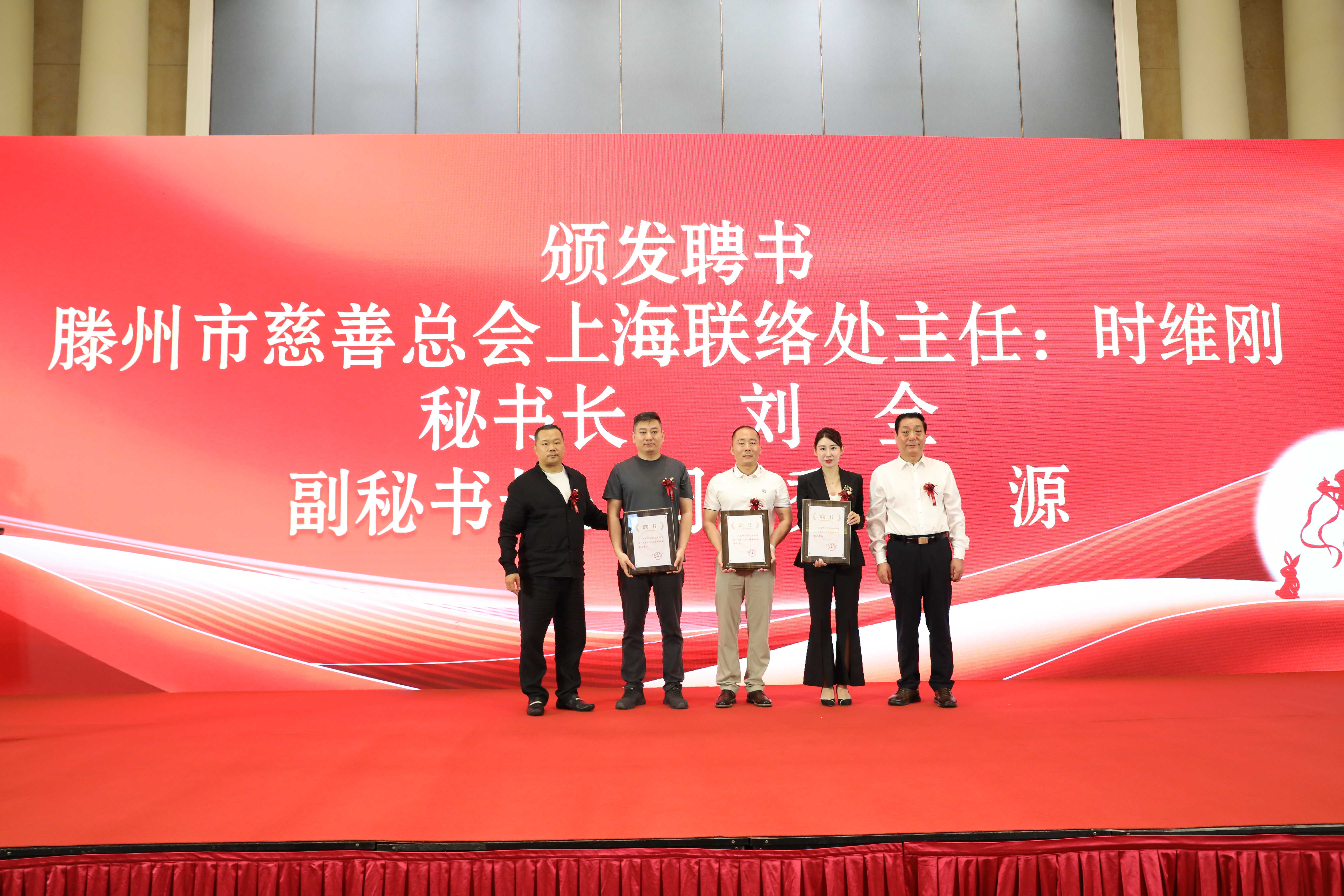 徐方坤和姜繁茂共同为滕州市慈善总会名誉会长杨位环、刘书海、王君琦颁发聘书,姜繁茂和翟华栋为滕州市慈善总会上海联络处主任时维刚,副主任倪华山、王胜利、王金水、王延杰、谭太凯、丁磊、王耀等颁发聘书,上海联络处主任时维刚为滕州市慈善总会上海联络处秘书长刘全,副秘书长周秀秀、洪源颁发聘书。