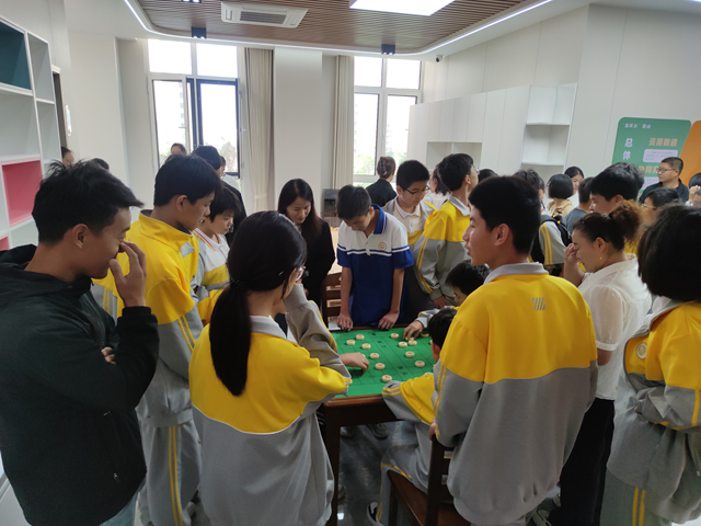 参观过程中,三楼的象棋桌前格外热闹。几名同学忍不住驻足对弈,棋盘上楚河汉界分明,落子间尽显思考与谋略。周边很快围满了围观的同学,大家或小声支招,或屏息观战,现场氛围轻松热烈。