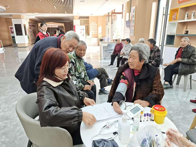 体检当天,社区党群服务中心内秩序井然,医护人员有条不紊地为老年人提供血压测量、抽血化验等基础检查项目,耐心询问日常饮食、用药情况,针对高血压等常见老年病给出个性化健康指导。社区志愿者全程协助引导排队、填写信息,为老人提供搀扶、倒水等暖心服务。