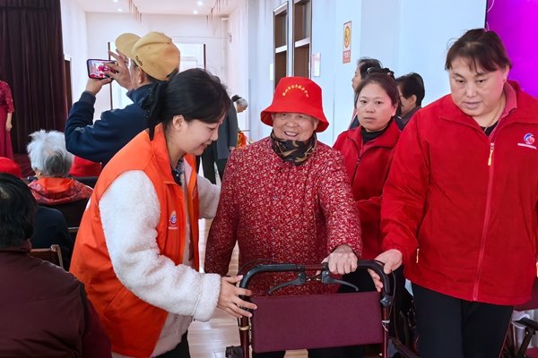 活动尾声,舞蹈《五星红旗》以鲜艳的红旗与优美舞姿诠释爱国情怀,《南泥湾》等经典红歌联唱更掀起全场互动高潮,长辈们与演职人员一同跟唱,熟悉的旋律回荡在养老院,满是温馨与感动。