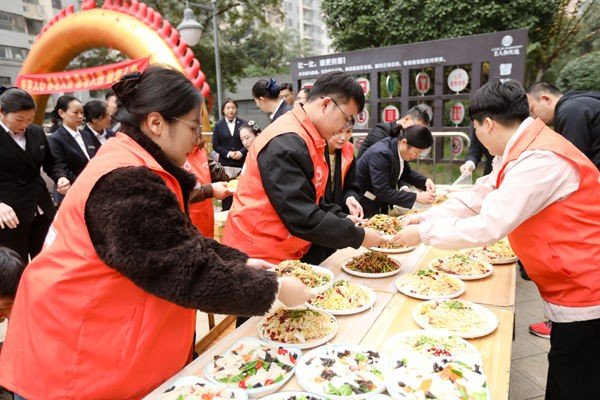 “开席啦!”随着一声声热情的吆喝,社区工作人员和志愿者们将精心准备的美食端上桌,为居民们添茶,耐心倾听大家的需求与建议,并向他们送上节日祝福。 空气里弥漫着各色饭菜的香味,这是浓浓的邻里情和幸福的味道。“好吃!”“香得很!”赞叹声此起彼伏,大家围在一桌,有说有笑,场面温馨而美好。