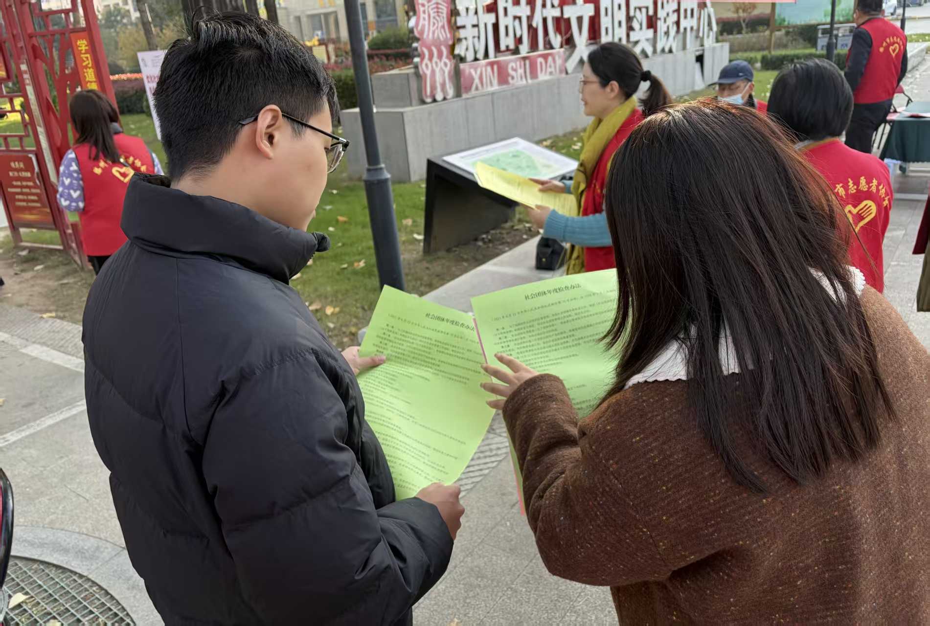 本次活动选取人流量较大的弘道公园设置宣传咨询点。活动现场,工作人员通过悬挂横幅,发放《民办非企业单位登记管理暂行条例》《社会团体年度检查办法》《中华人民共和国慈善法》宣传单页,向过往群众详细介绍社会组织的职能作用、政策法规。