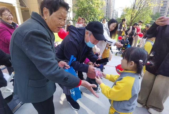 活动后半程,幼儿园小朋友为老年人带来拍篮球、跳律动操表演,还主动拉长辈互动;长辈们笑意满满,现场满是欢乐,尾声社区赠送袜子传递节日温暖和关怀。