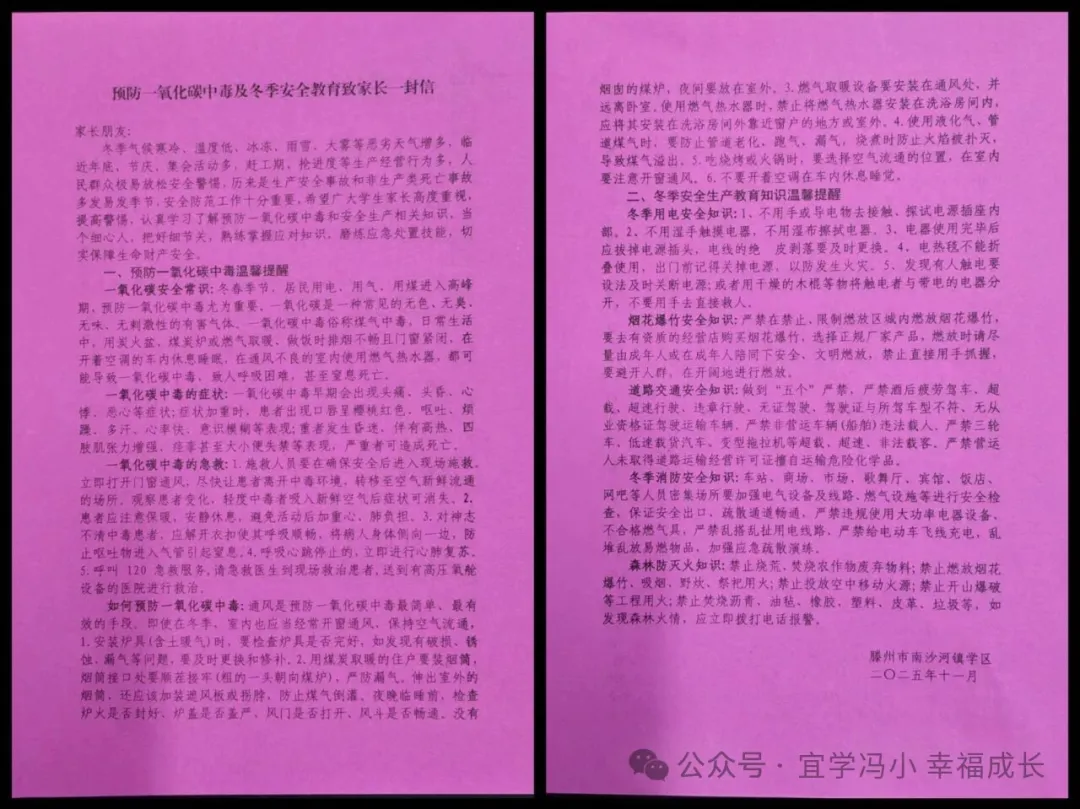 为将安全教育延伸至家庭,形成家校共育的合力,我校精心撰写了《预防一氧化碳中毒及冬季安全教育致家长的一封信》,并通过纸质发放、班级微信群、学校公众号等多种渠道送达每一位学生家长手中。信中详细列举了家庭日常生活中可能产生一氧化碳的安全隐患,如燃气灶具、燃气热水器、燃煤(炭)取暖设备、燃油发电机等的使用注意事项;强调了保持室内通风换气的重要性;指导家长如何正确安装和使用相关设备,定期检查维护排烟管道;明确了发生疑似中毒情况时的应急处理步骤。信末,学校恳请家长朋友们高度重视冬季取暖安全,切实履行监护责任,与孩子一起学习安全知识,排查家庭安全隐患,共同为孩子营造一个安全、温暖、健康的成长环境。
