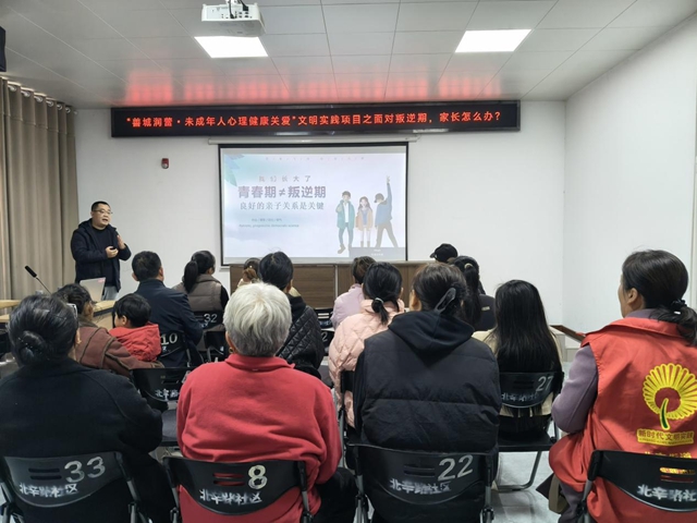 为深入推进未成年人心理健康关爱工作,帮助家长破解孩子青春期叛逆教育难题,11月7日,由滕州市委宣传部、市新时代文明实践服务中心发起实施的“善城润蕾·未成年人心理健康关爱”文明实践项目走进北辛街道北辛路社区。活动以“面对叛逆期,家长怎么办?”为主题,邀请滕州市双飞燕青青健康教育协会的资深心理学专家满孝典老师主讲。20余名家长齐聚一堂,共赴这场关乎成长与沟通的心灵之约。