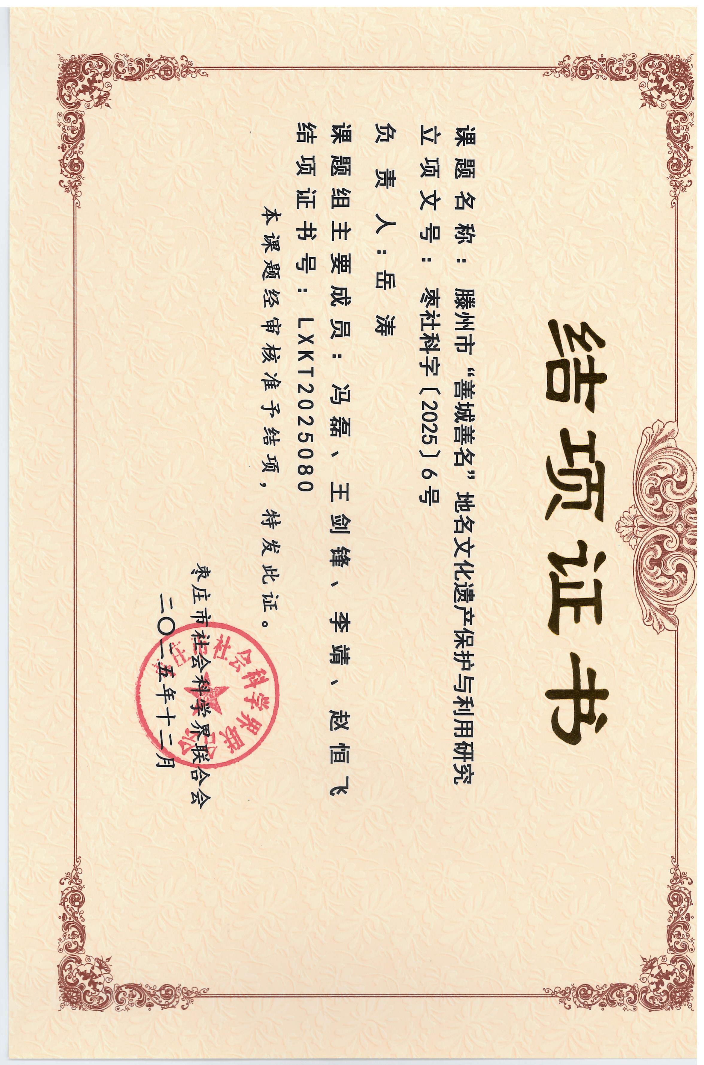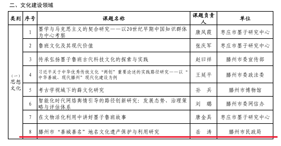 近日从枣庄市传来喜讯,滕州市民政局牵头市教体局、市住建局申报的《滕州市“善城善名”地名文化遗产保护与利用研究》课题,经滕州市社科联初审和重点推荐,枣庄市社科联组织专家评审鉴定及结果公示,顺利得以结项。