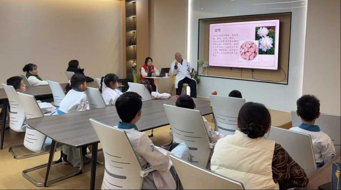善品国医馆朱大夫以《神农尝百草》的故事引入,用童趣语言讲解中医起源,工作人员将白芍、茯苓、丹参等药材展示给孩子们。孩子们通过“摸、闻、尝”多感官互动,惊叹于“甘草的甜”“薄荷的凉”,甚至争相分享“我奶奶也用这个泡茶!”的日常发现。