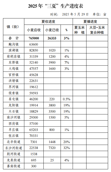 截至5月29日,全市小麦收获2.63万亩,约占应收面积的3%,基本集中在东部丘陵、山地;预计6月5日小麦进入收获高峰期。